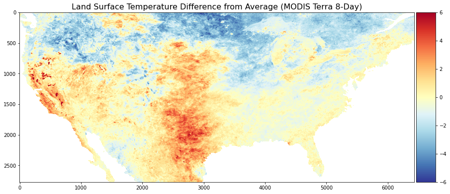 Utilizing gsutil, you can copy your map file from google cloud storage to local storage/colab files. Then you can open it using your geospatial package of choice and generate a map using it. The example below utilizes Matplotlib to generate a Land Surface Temperature Trend map using the MODIS Terra 8-day tif requested previously. You can customize it with a color bar, title, etc. The map can be exported as a png for use in reports, presentations, etc.