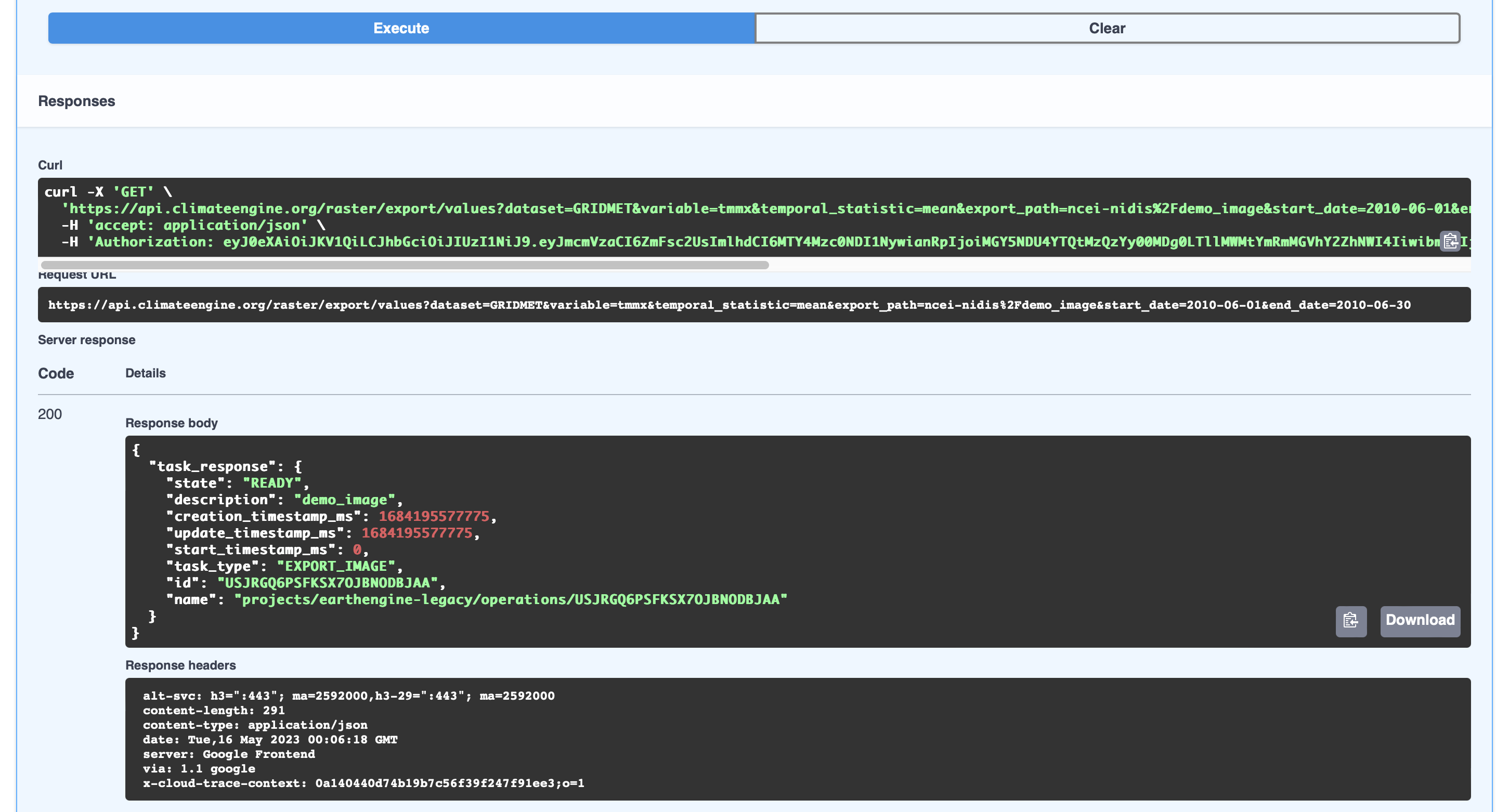 Once you click the execute button, you get multiple outputs. The curl and request URL show the request you made. The response body outline the task generated from the parameters you submitted. You can see that the state of the task starts as ready. As the task is completed, the state is updated to COMPLETE. You can check the state using the /export/task_update endpoint and the task id (which is right above name is the response body).