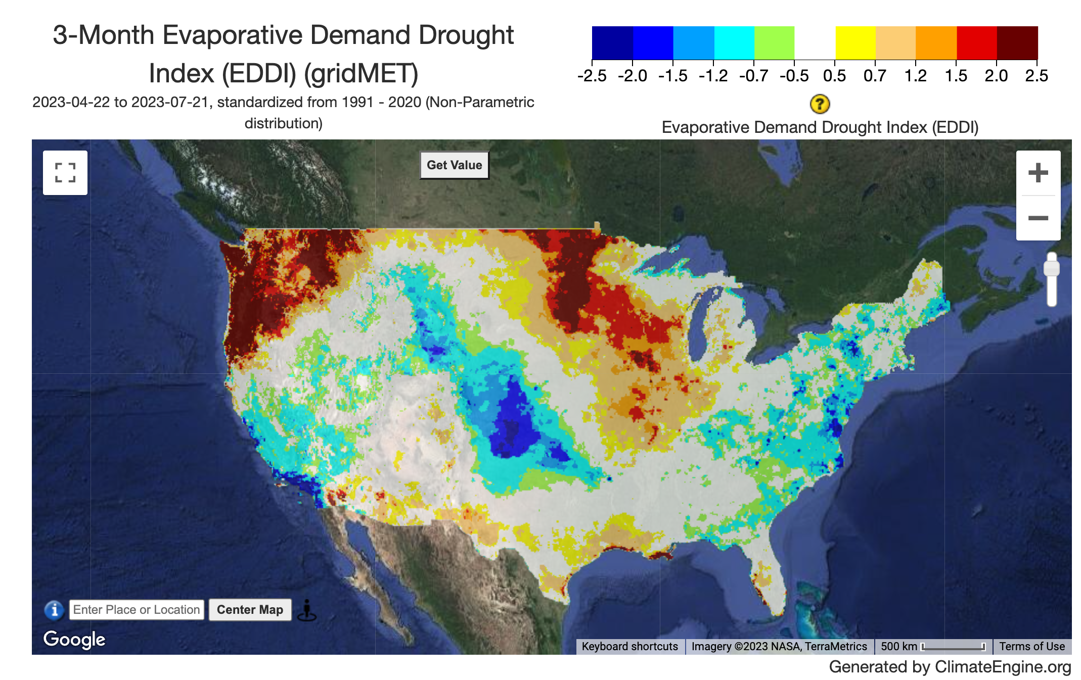 An example map of 3-month Evaporative Demand Drought Index (EDDI) for July 21, 2023 from GridMET climate reanalysis dataset.