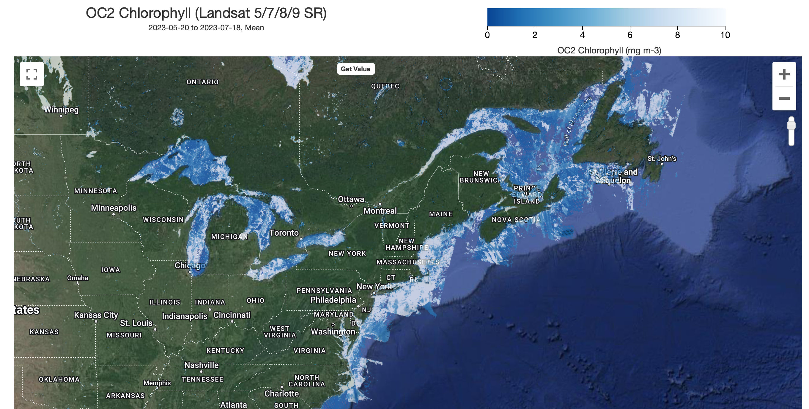 An example map of Ocean Chlorophyll for May-June-July 2023 using Landsat data.
