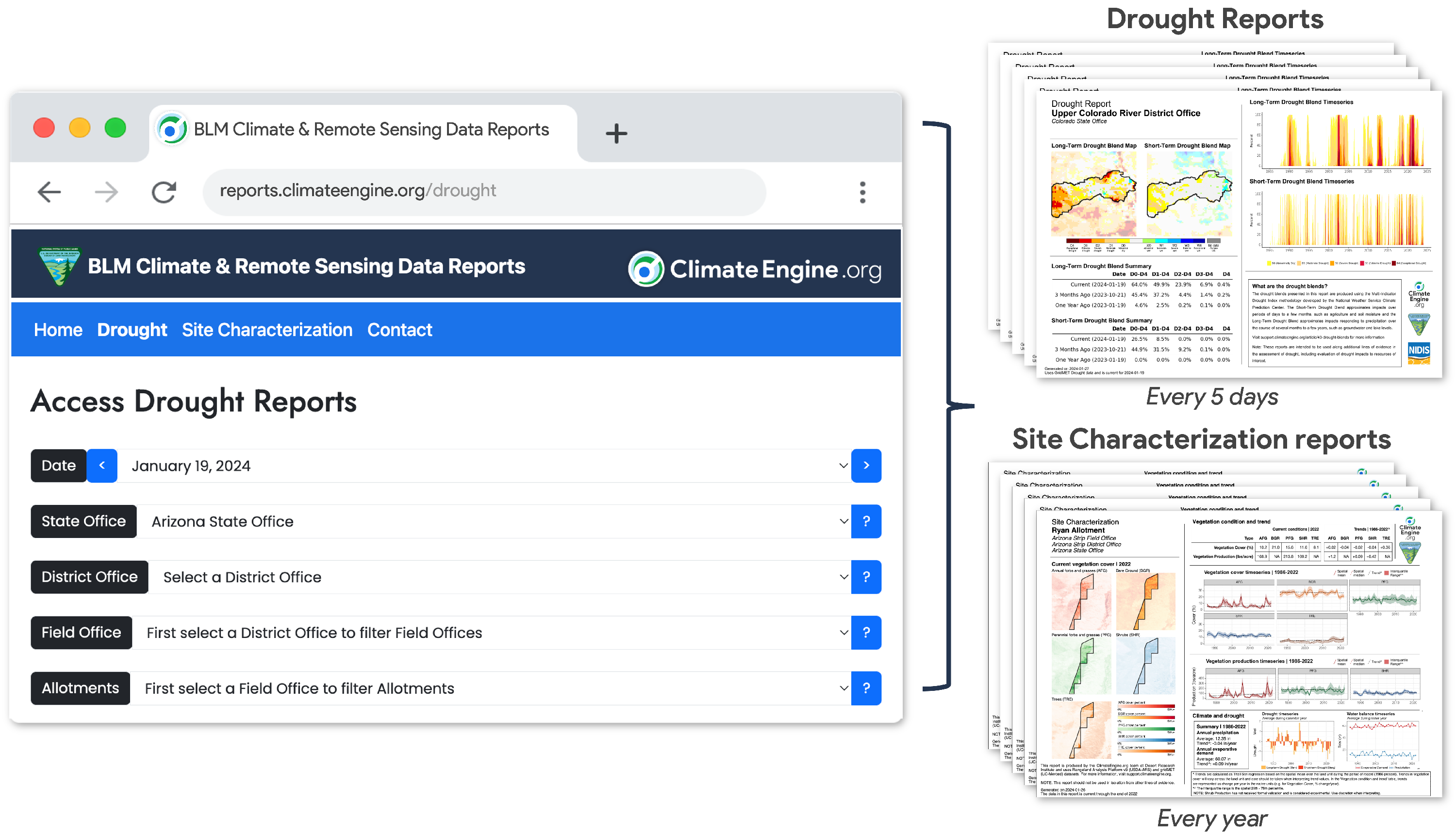 To simplify and streamline the availability of satellite-based vegetation data, our team at ClimateEngine.org has partnered with the BLM to provide Site Characterization reports for all BLM state offices, district offices, field offices, and grazing allotments in the conterminous 48 states.