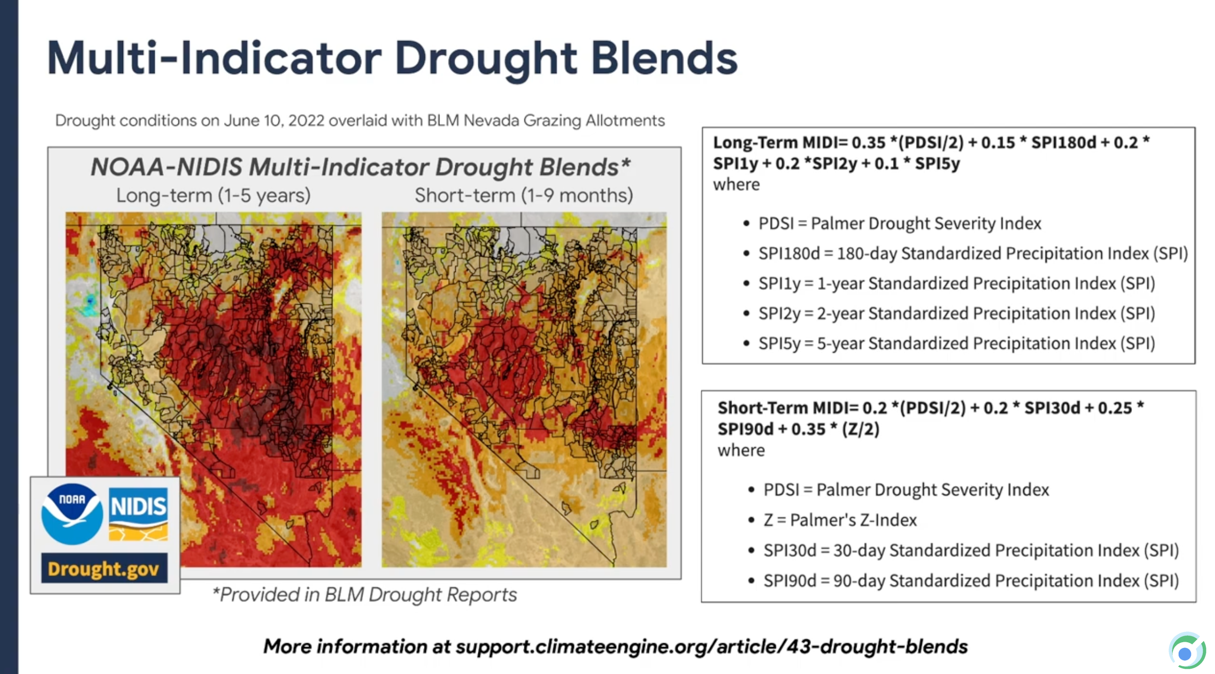 GridMET Drought provides dozens of drought indicators using the gridMET dataset that we just discussed. Two important indicators are the multi-indicator drought blends, specifically the Long-term and Short-term Drought Blends. These are the drought indicators that we use in the Drought reports provided at reports.climateengine.org and are important because they represent two different time periods of drought, which capture drought impacts to different types of resources. We provide these two drought indicators in the Site Characterization reports to ensure consistency with the Drought reports and to provide context about drought as it pertains to vegetation data presented in the reports. We produced a similar tutorial video on the Drought videos that you can access by clicking the card in the video.