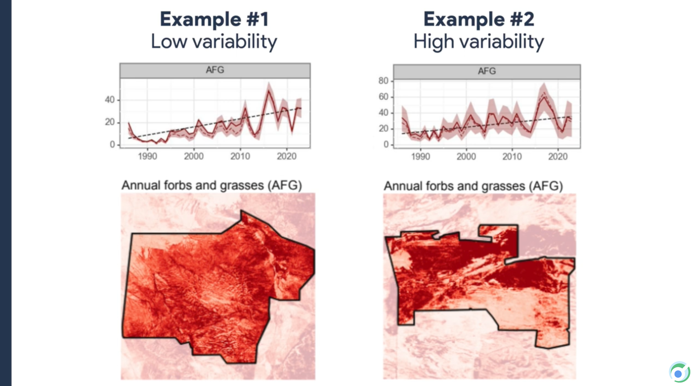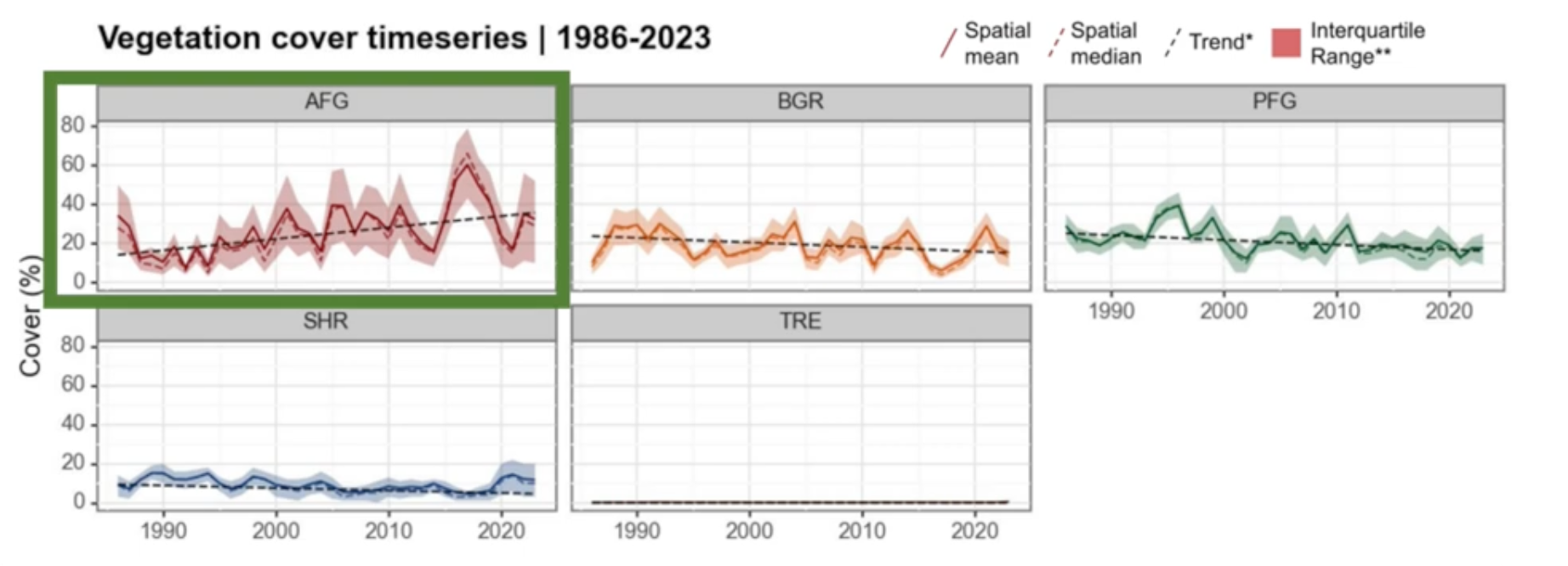 In the annual forbs and grasses chart in the ‘Vegetation cover timeseries’ figure, the red solid line represents the spatial mean and the red dashed line represents the spatial median. These statistics indicate the average, but when they diverge from one another they can provide useful information. Notice that in the years between 1995-2010 the mean value is somewhat higher than the median. The mean is more sensitive to outliers, so this indicates that there were parts of the land unit that had very high cheatgrass cover that were dragging up the mean relative to the median. In the years since 2010, the mean and median have been relatively similar, possibly indicating that cheatgrass has infilled more homogenously across the land unit.