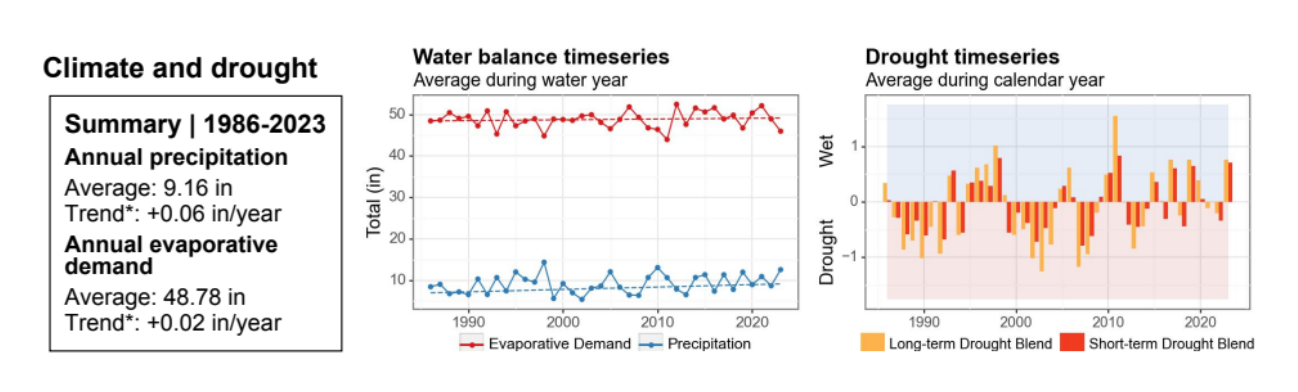 In our first example, we can see in the Summary table that there is an average of 9.16 inches of precipitation and 48.78 inches of evaporative demand during the water year. Importantly, both precipitation and evaporative demand have been increasing over time.