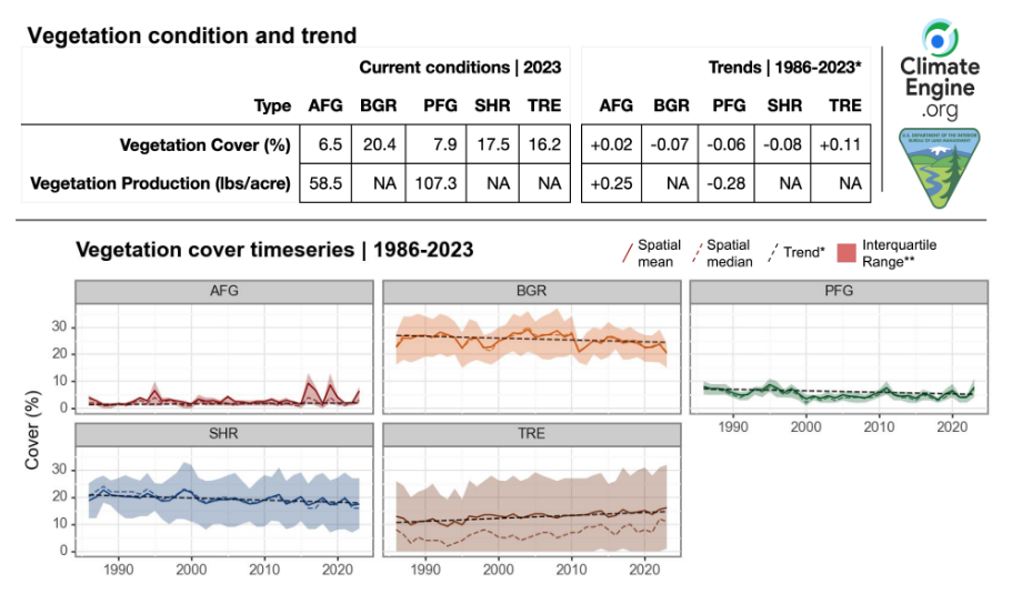 For more customized analysis of the datasets presented in the Site Characterization reports you can use the Climate Engine app or API, both of which you can learn more about at climateengine.org. The Climate Engine app has been supported continuously by the Bureau of Land Management since 2015 and is built on Google’s cloud computing platform Google Earth Engine, allowing for rapid analysis of decades of climate and satellite-based vegetation datasets.