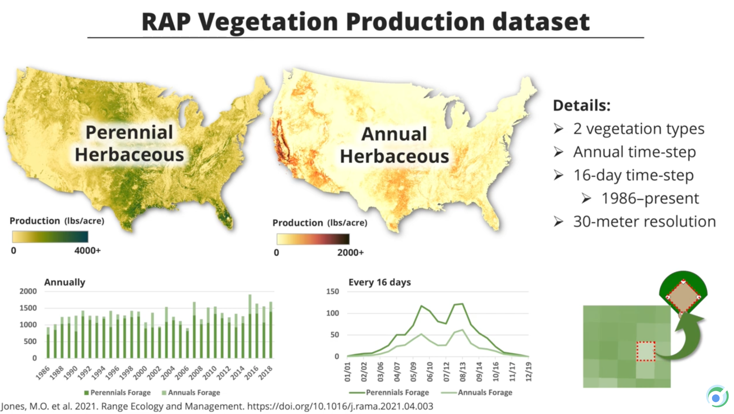 The Vegetation Production data are also provided as yearly maps of vegetation types from 1986-2023 and are provided at a 30-meter spatial resolution as well. However, for the Vegetation Production data, there are only two vegetation types provided — annual forbs and grasses and perennial forbs and grasses — and each pixel represents production in terms of lbs/acre.