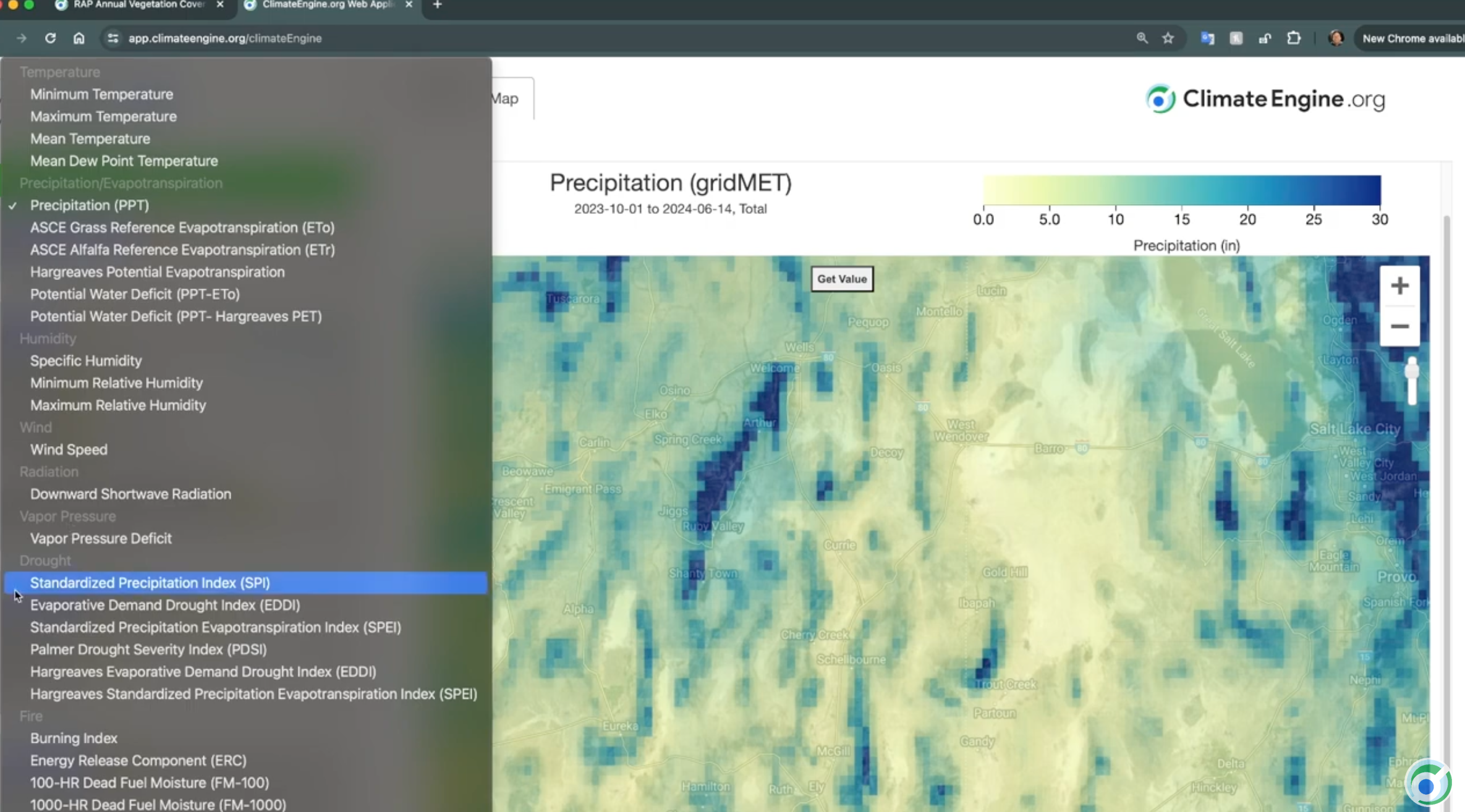 Screenshot of gridMET variables and mapping in Climate Engine App.