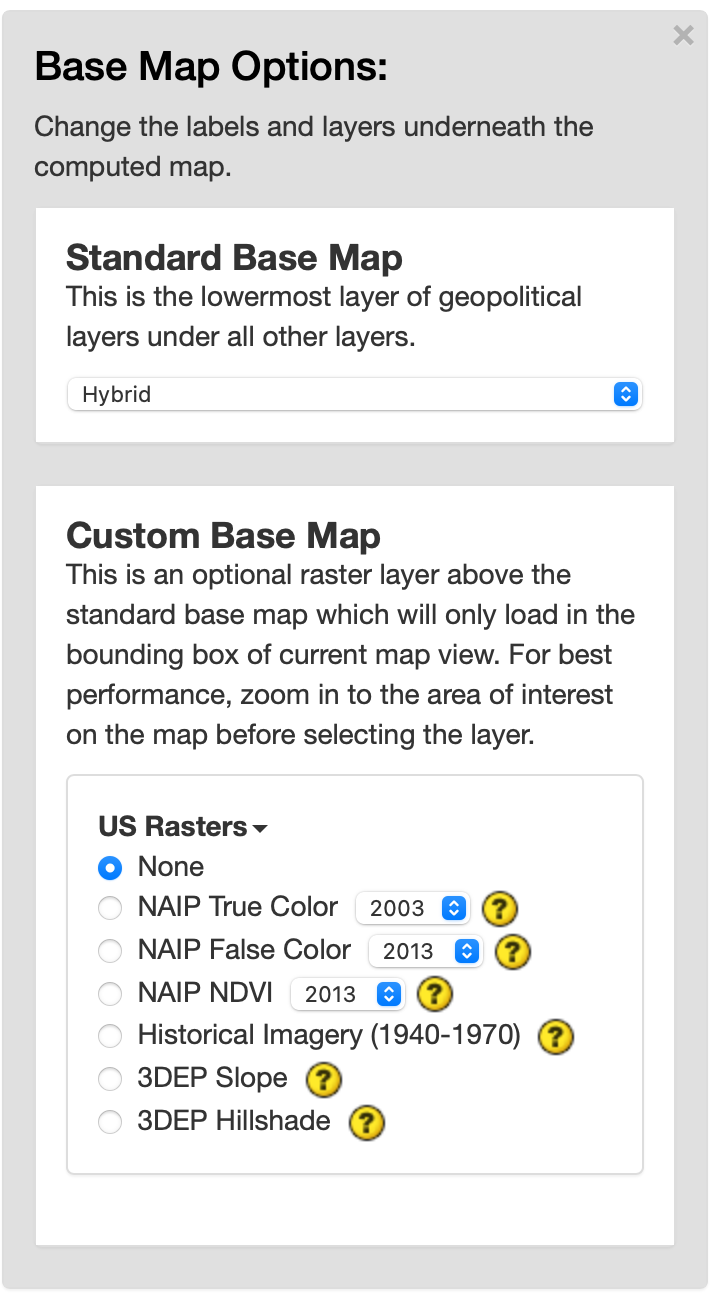 If you are interested in a custom base map, such as high-resolution imagery and high-resolution digital elevation models (DEMs), Climate Engine also has the option to select a custom base map in the same dropdown. Here you will see toggles for the different raster options. The default is set to None. To learn more about each data option, click on the (?) next to the layer. This will direct you to a documentation page. You can only select one option at a time. If you are selecting an option with year options, update the drop down to the year of interest. Then click the circle next to the layer of interest to turn it on. This will add the layer to the map. The Legend will appear below the Status section. Note: Not all years have imagery for all areas. If you select a Custom Base Map with year options, green text noting years available will appear when that option is selected. Additionally, for best performance, zoom in to the area of interest on the map before selecting the layer.