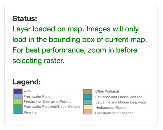 In the Raster section, you will see toggles for the different raster options. The default is set to None. To learn more about each data option, click on the (?) next to the layer. This will direct you to a documentation page. You can only select one option at a time. Then click the circle next to the layer of interest to turn it on. This will add the layer to the map above any base maps or computed maps. The Legend will appear below the Status section. To control the visibility of the custom base map just added, you can adjust the transparency toggle added to the top right of the map.