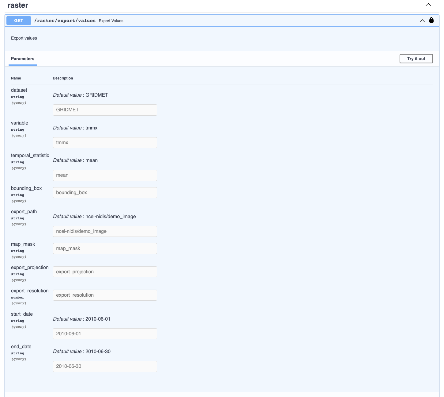 To try out an endpoint, scroll to the endpoint of interest. Click the downward facing arrow on the right side of the endpoint to expand the endpoint box. Then click the button labeled Try it out. This allows you to edit the parameters boxes and execute a request. Each endpoint has a different set of parameters it requires, and more details on the different endpoint parameter requirements and options can be found under the Endpoint Parameters section of the Climate Engine API tab of this site.