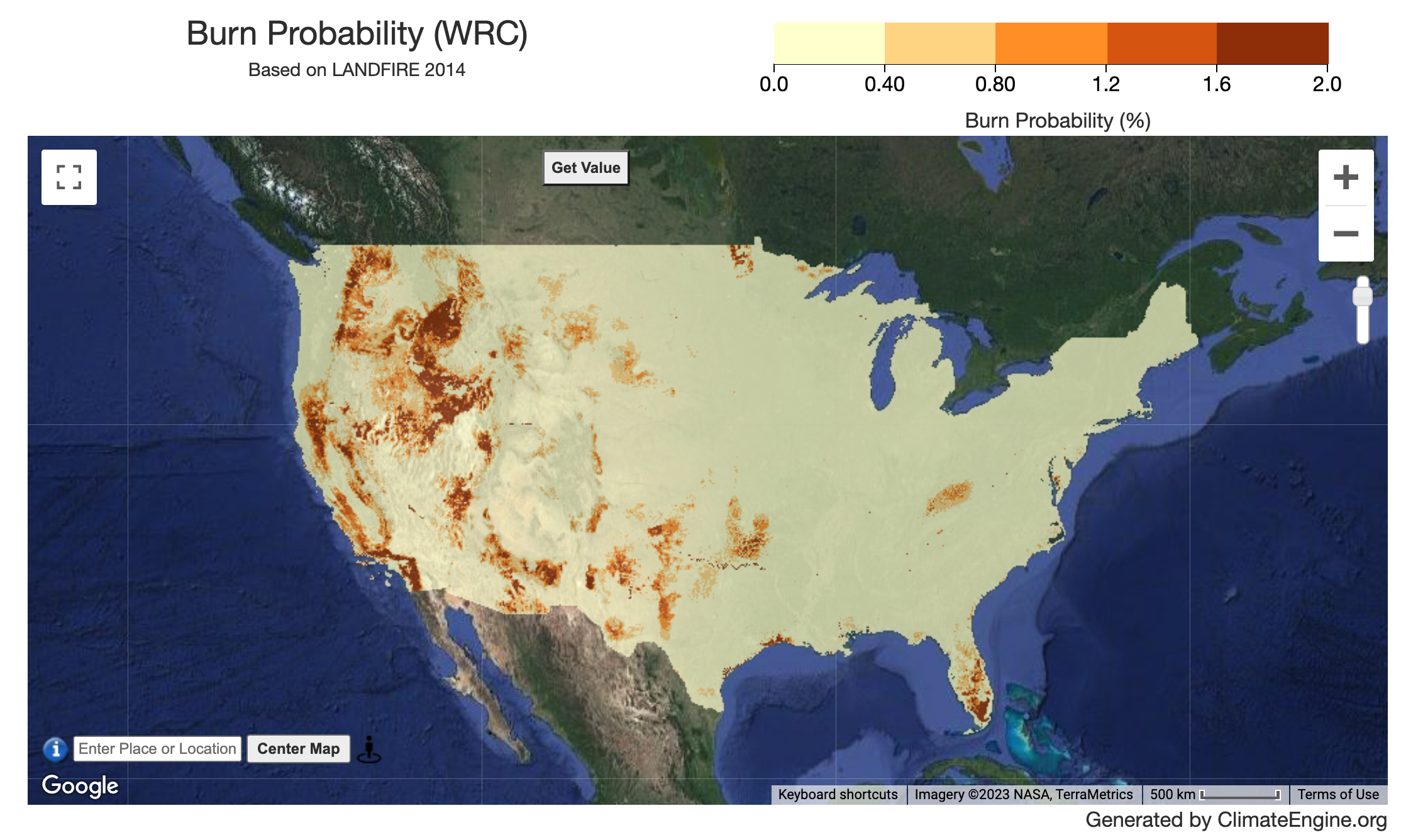 - Conditional Flame Length - Most likely flame length at a given location if a fire occurs, based on all simulated fires; an average measure of wildfire intensity.