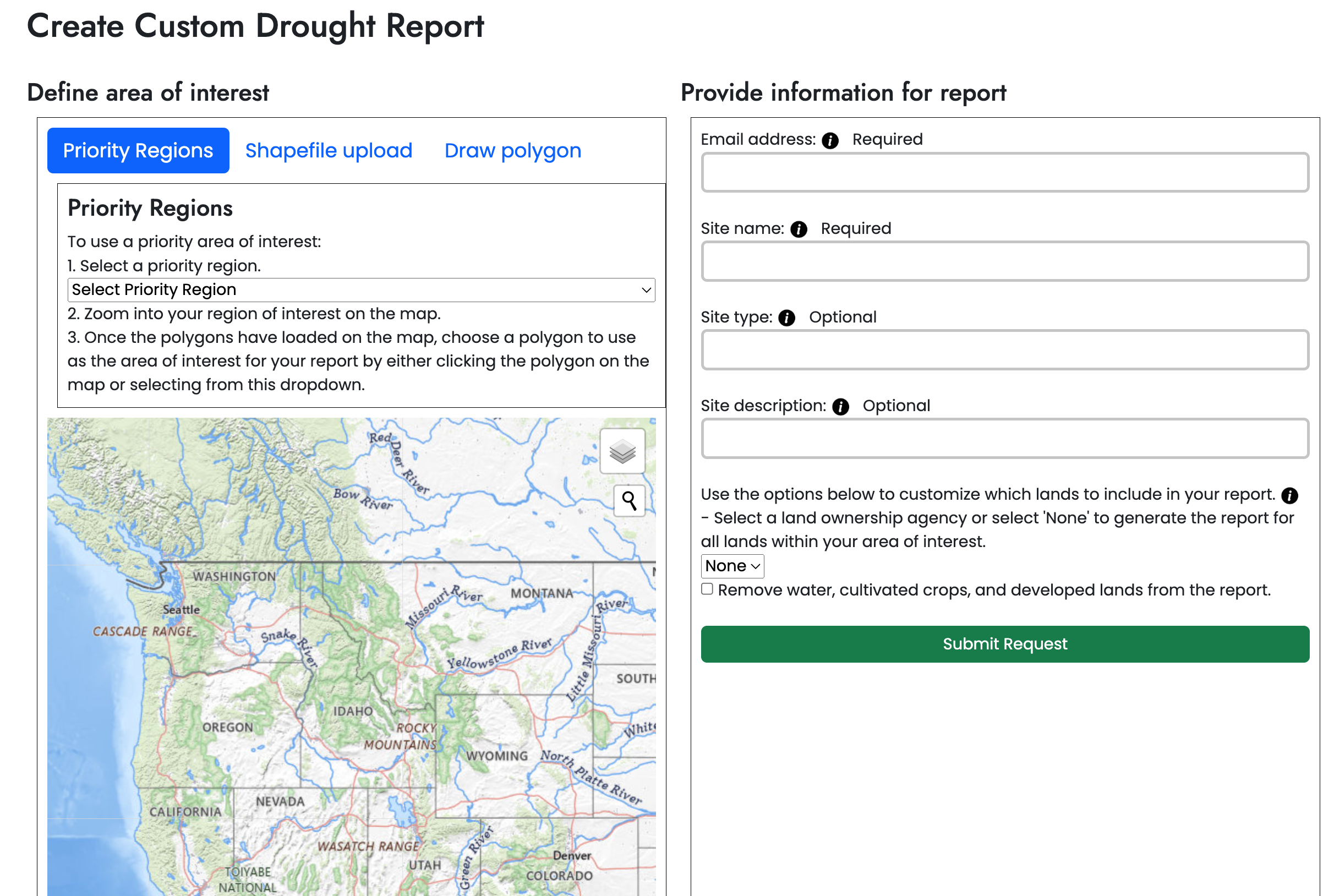 There are three 'areas of interest' options to select an area to generate a report for. The first option is selecting a 'Priority Region'. These are pre-loaded regions that may be of interest to a variety of users. When one of the 'Priority Region' datasets is selected, the regions are added to the map on the left of the UI. For some regions, you may have to zoom in further to see them. To select an area within the 'Priority Region' you can either utilize the drop-down or click on the area in the map. Once you select an area, the Site Name will be updated on the right side of the UI.