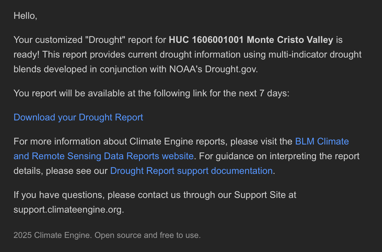 The email will come from no-reply@climateengine.org and the subject line will reference the 'Site name' you provided. For this example, the subject line is 'Your Drought Report for HUC 1606001001 Monte Cristo Valley is Ready!'. All you have to do to access your report is click 'Download your Drought Report' and a folder containing the underlying data, the images, and reports will be downloaded.