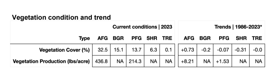 In terms of “Current Conditions”, we can see that in 2023 there was an average of 650 lbs/acre of herbaceous vegetation production across the land unit, with about half of that coming from annual forbs and grasses. Additionally, the “Trends” show that annual forbs and grasses have been strongly increasing during the period of record while shrubs have been declining.