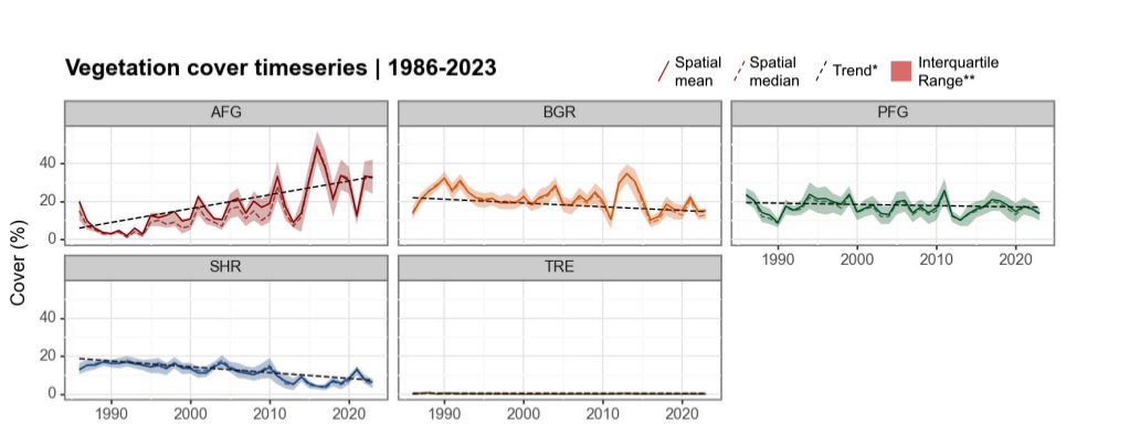 It’s important to highlight two important considerations when interpreting the trend values and trend lines in this report. The first detail to be aware of is that the trend statistics are calculated based on the spatial averages across the land unit. So, in cases where the trend is near 0 for a given vegetation type, there will often still be areas within the land unit that are trending upward and others that are trending downward even if, on average, there is no trend. Similarly, even if a land unit shows a positive trend in, say, shrub cover, there still may be areas within that land unit that are trending downward. The second detail is that we do not calculate significance in terms of trend, so care should be taken when interpreting trend values.