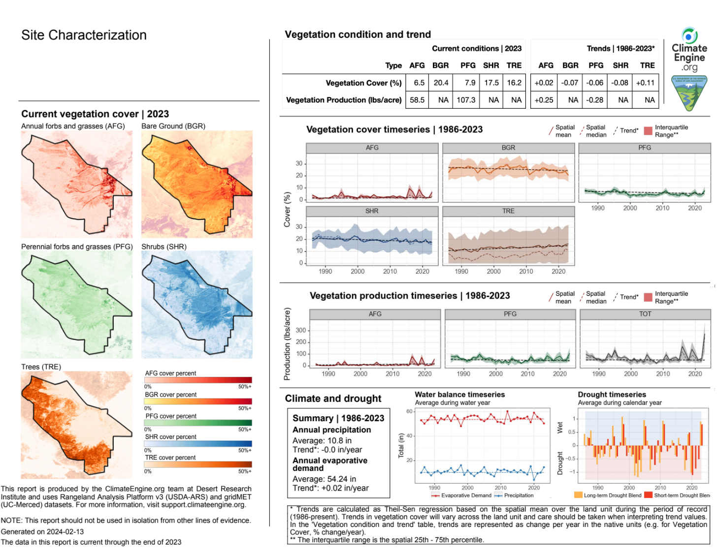 Site Characterization Report. Includes four different sections: Maps, Table, Cover + Production Timeseries, Climate + Drought.