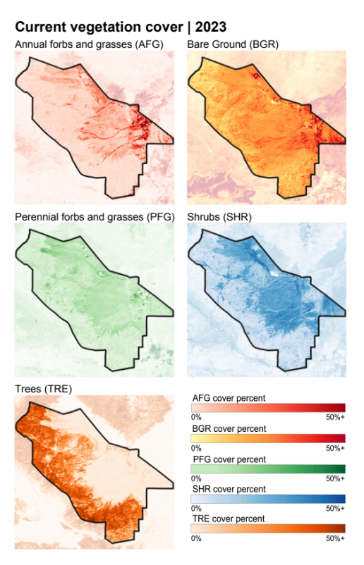 The Vegetation Cover data are provided as yearly maps of vegetation types from 1986-2023 and are updated every year. Five vegetation cover types are provided — annual forbs and grasses, perennial forbs and grasses, shrubs, trees, and bare ground — and the maps are provided at a 30-meter spatial resolution. That means that each pixel in the image represents roughly the area of the infield of a baseball diamond. For each pixel, a value between 0-100 is provided, which is the percent cover of that vegetation type for that location.