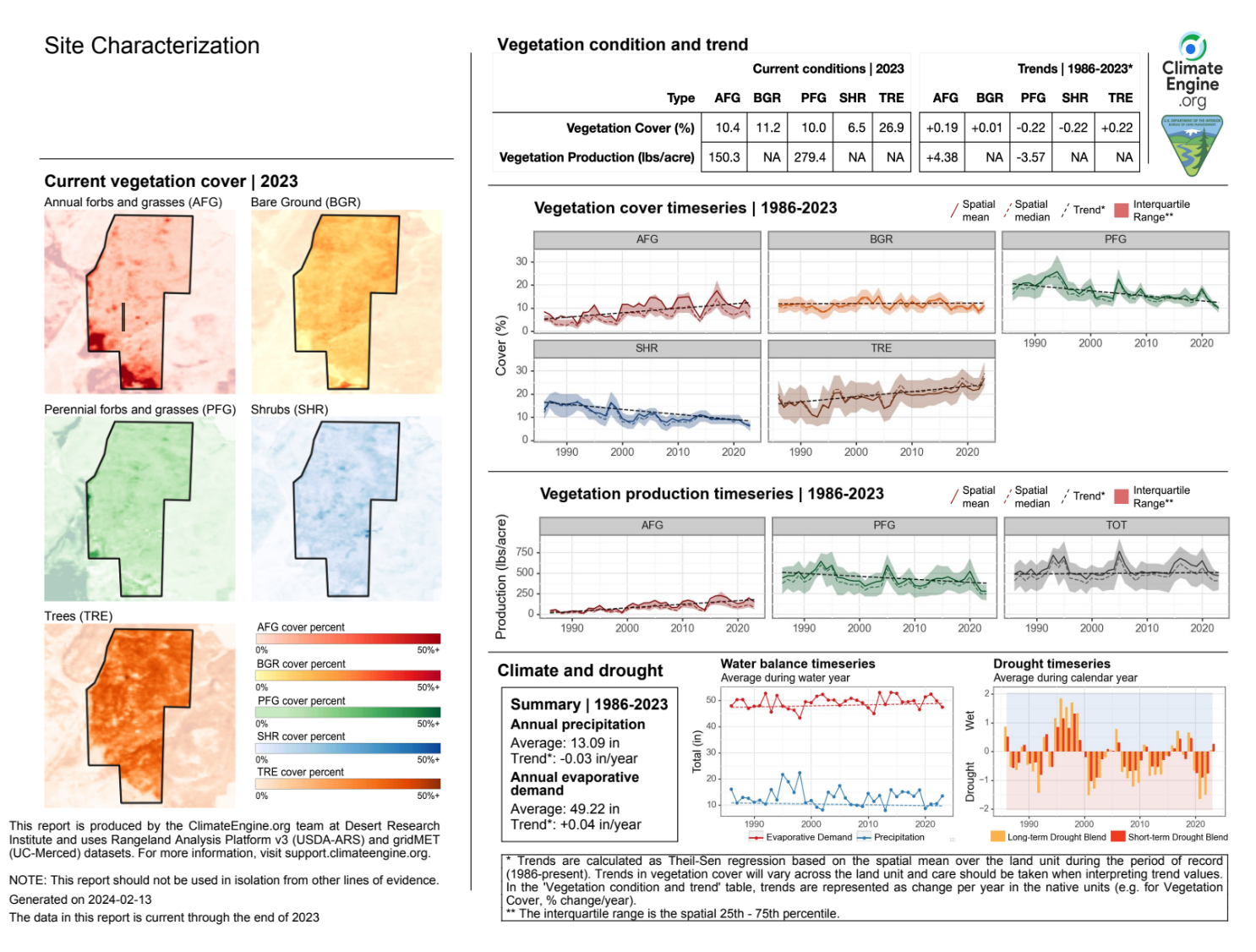 The Site Characterization reports provide a wealth of information on vegetation and climate that can be useful for informing management. Even still, care should be taken when using climate and satellite-based vegetation datasets, as ultimately they are models of complex systems. These reports will be most useful when used alongside additional lines of evidence to inform decisions, such as field-based vegetation, ecological sites, photopoints, local climate stations, and other locally available datasets. Together, these different information sources can help to form a more comprehensive picture of a land unit and its history, providing a firmer footing for informing decisions.