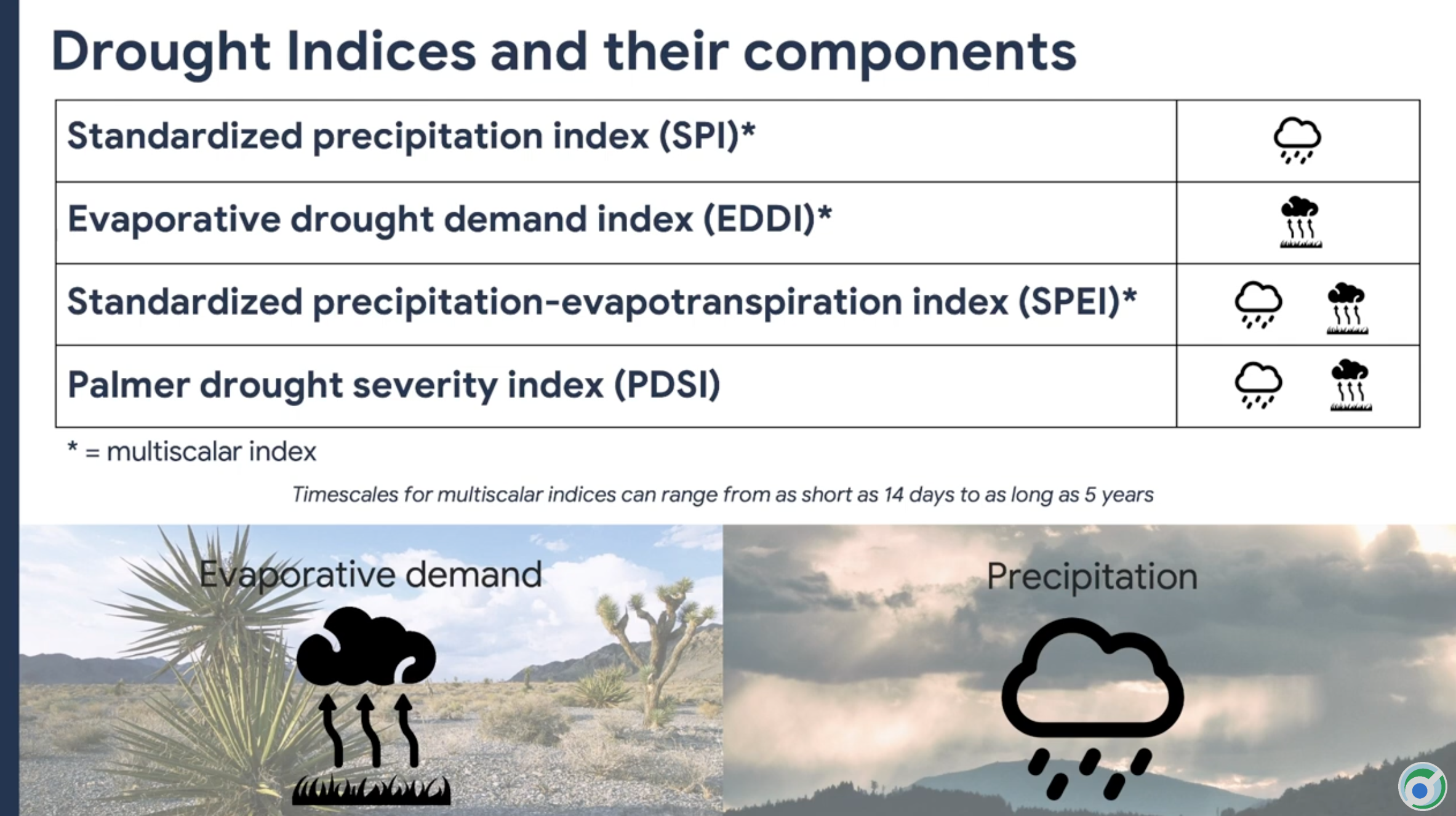 Overview of common drought indices and their components, i.e. precipitation and evapotranspiration.
