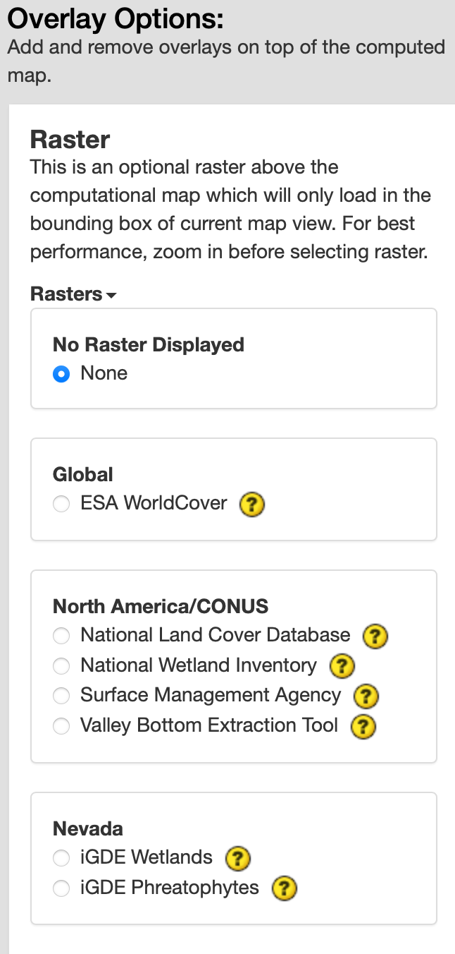 In the Raster section, you will see toggles for the different raster options. The default is set to None. To learn more about each data option, click on the (?) next to the layer. This will direct you to a documentation page. You can only select one option at a time. Then click the circle next to the layer of interest to turn it on. This will add the layer to the map above any base maps or computed maps. The Legend will appear below the Status section. To control the visibility of the custom base map just added, you can adjust the transparency toggle added to the top right of the map.